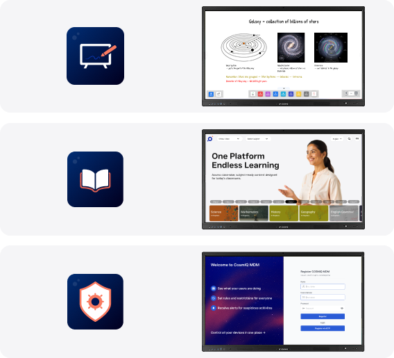 COSMIQ Draw, Learn, and Guard enable interactive teaching, bilingual curriculum delivery, and secure centralized device management. Our India developed software platforms and AI engines are adaptable and scalable.